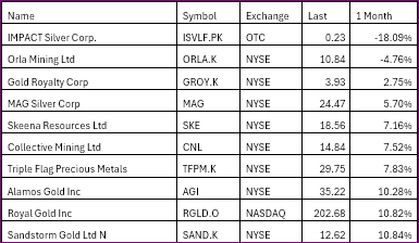 Processing note: When I changed this table to properly show the negative figures in the column, I replaced it with a table that contains MAG Silver. MAG Silver stopped trading in September, so the data in that row is incorrect.