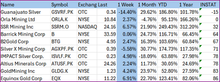 The INSTAT scores are almost universally “perfect,” with a few exceptions. The lowest INSTAT scores are (in order) Guanajuato Silver -- the only negative INSTAT score – followed by Orla Mining, and SSR Mining.