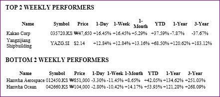 Recommendations: STRONG BUY Kakao Corp (035720.KS) targeting ₩55,000, BUY Yangzijiang Shipbuilding (YAZG.SI) targeting $2.50, HOLD Hanwha names with tactical trimming above ₩900,000 for Aerospace and ₩110,000 for Ocean.