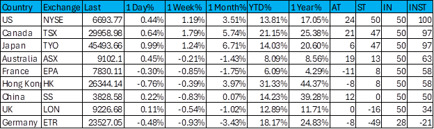 The global equity landscape reflected mixed sentiment, with Asia (Japan) and North America (Canada) providing the strongest daily leadership, while Europe presented pockets of short-term weakness amidst longer-term gains for some exchanges.
