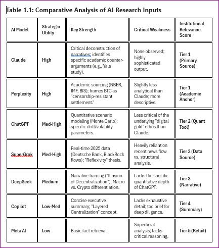 The initial phase of this research involved a comparative stress test of the seven AI models I used with the same prompt—ChatGPT, Claude, Copilot, DeepSeek, Meta AI, Perplexity, and SuperGrok—tasked with dissecting Bitcoin’s value proposition, market structure, and risk profile. The results of this comparative analysis are foundational to understanding the quality of data underpinning the subsequent chapters.