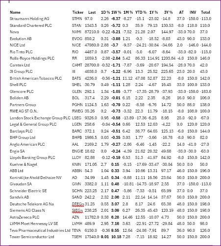 Monthly Anomalies (≥±12.5%): Multiple securities triggered monthly considerations, including Teva (+12.64%), London Stock Exchange Group (LSEG, -13.89%), and AstraZeneca (+14.46%).